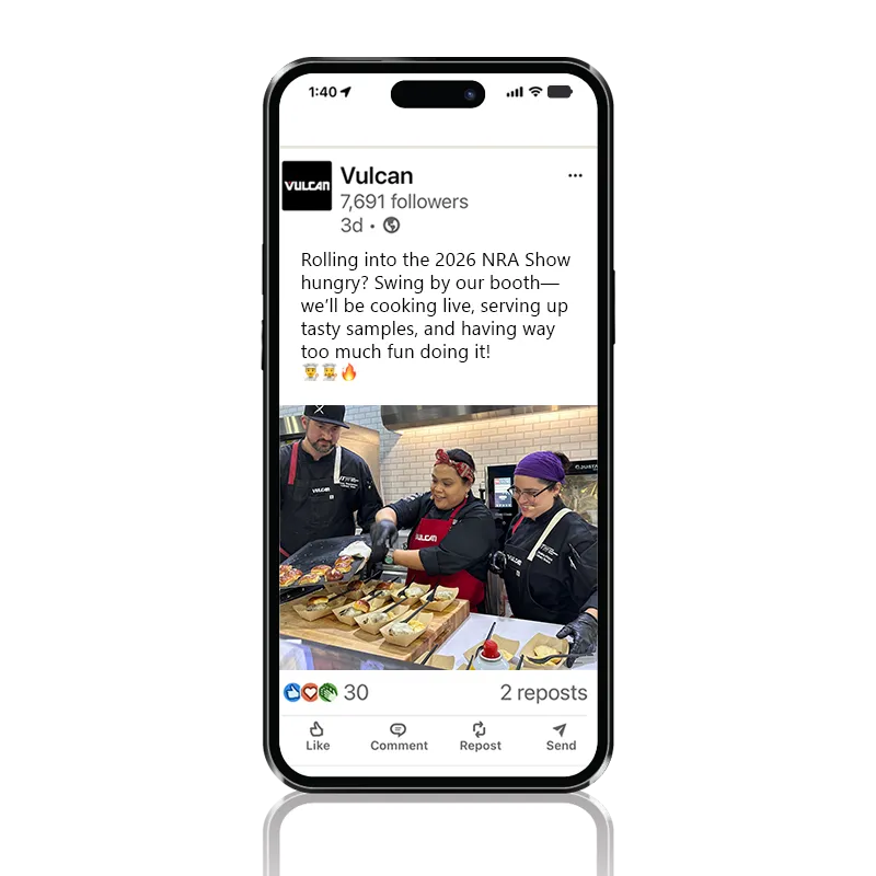 Visit booth #4031 to see Vulcan equipment in action alongside Hobart, Baxter, and Traulsen of the ITW Food Equipment Group at the National Restaurant Association Show 2026! Stay for our live, daily cooking demos to learn (and taste!) how ITW equipment supports kitchen operations from prepping to storage, and cooking to cleaning. If you haven't met Chef'sCombi yet, this is your chance to experience its intuitive, customizable interface, programmable recipes, and an easy cleaning system – just a few features that help optimize restaurant kitchen operations!